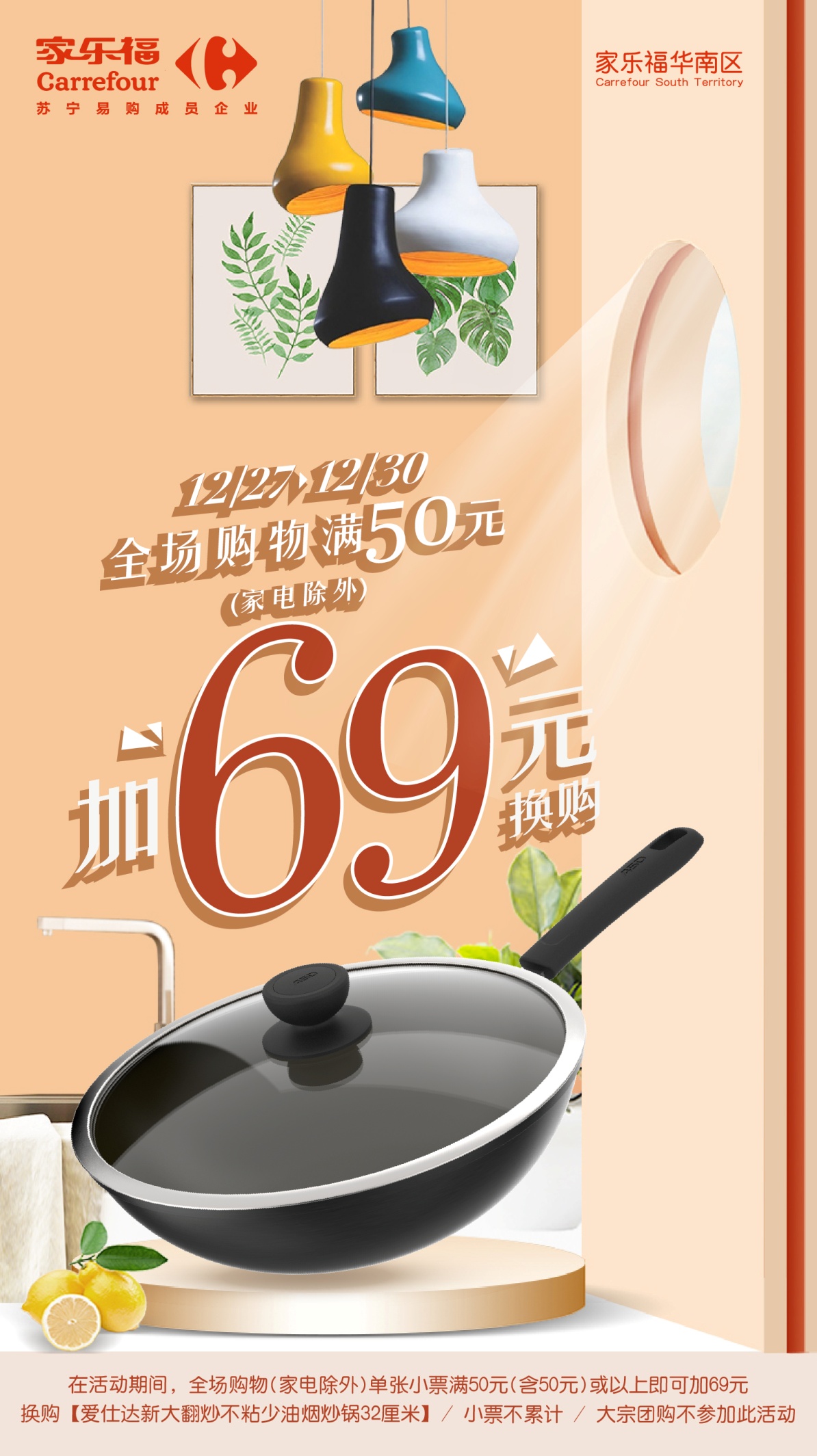 最后播報一則“筍盤”信息。12月27日至30日,顧客在家樂福華南區門店全場購物滿50元,還可加69元換購愛仕達新大翻炒不粘少油煙炒鍋32厘米(家電、大宗團購除外,小票不累計)。