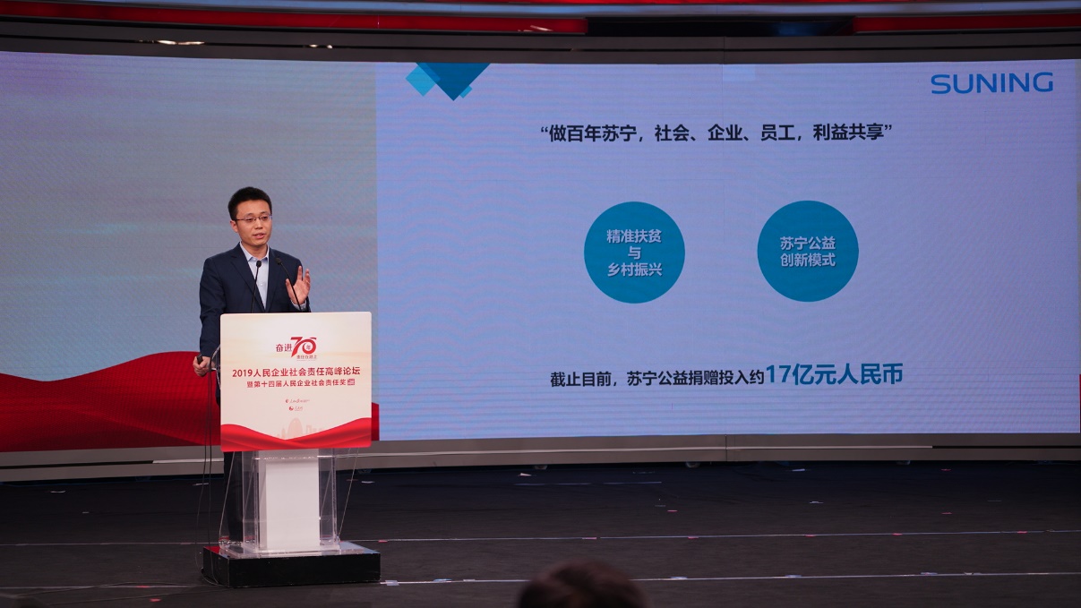 深圳新聞網2019年12月31日訊 12月27日,2019人民企業社會責任高峰論壇暨第十四屆人民企業社會責任獎頒獎典禮在人民網舉行,各大企業代表分享經驗。蘇寧榮獲第14屆人民企業社會責任獎“年度扶貧獎”獎項,表彰蘇寧在扶貧領域深入、專業的投入,這也是蘇寧第七次獲得人民企業社會責任獎。
