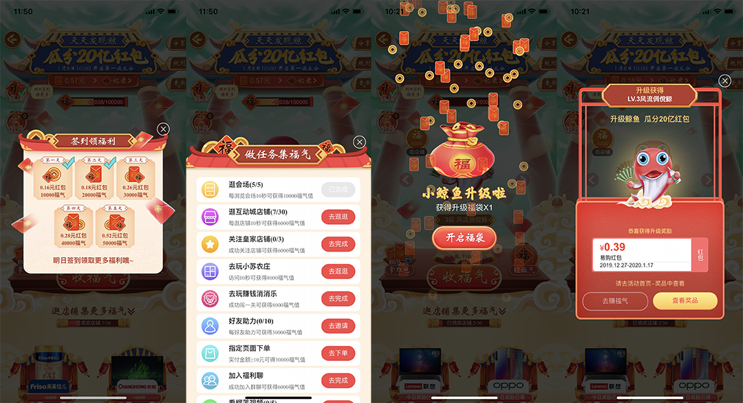 用戶通過做任務、每日簽到、逛品牌店鋪,或者訪問小蘇的農莊、玩賺錢消消樂福利游戲均可獲得福氣值以喂養鯨魚,收集到的福氣值越多,福袋將變得越大,鯨魚升級也越快,可領取的紅包金額也越大。