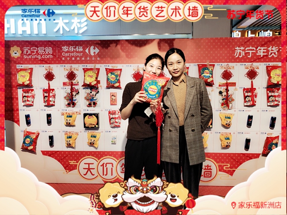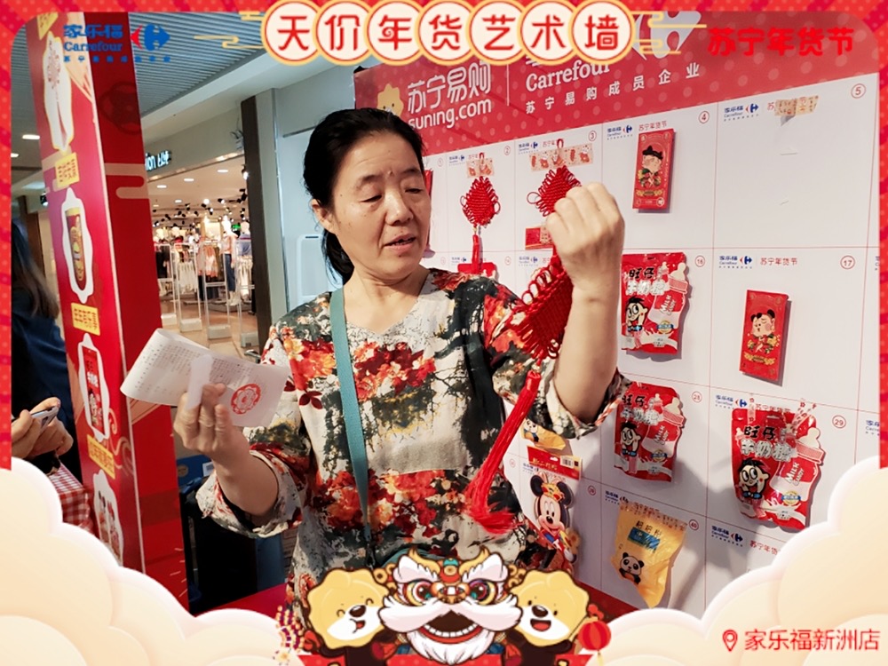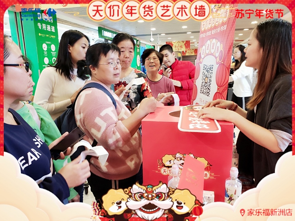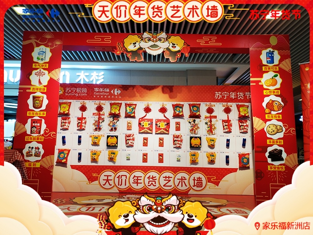 天價年貨藝術墻,藝術年貨送不停 ! 1月17日 至 1月 19 日 , 家樂福華南區廣州員村店、珠海吉大店、福州寶龍店 、廈門中華城店及 深圳新洲店 (活動時間為1.16-1.18) 活動繼續 。 禮品數量有限,每天送完即止 !蘇寧家樂福 實力助你過年味滿滿的春節 ,邀請您 來把年貨驚喜領回家 !