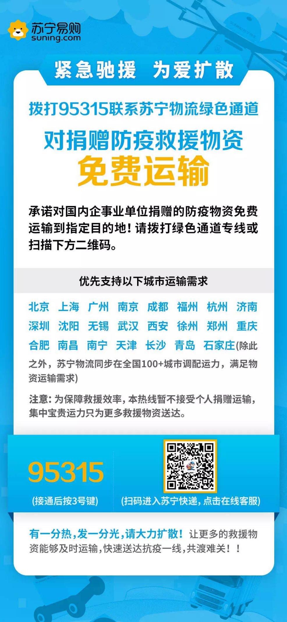 一方有難,八方支援。除夕夜的聲援只是開始。大年初一下午4點,蘇寧物流正式開通“綠色通道”,接受地方政府、公益組織等對武漢地區的援助物資運輸需求,第一時間將援助物資配送至抗疫前線。通道一經開通,需求立即涌入。