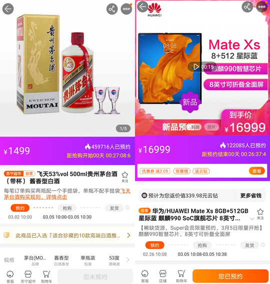 截止到開售前,蘇寧易購平臺飛天茅臺預約量將近46萬人,華為Mate Xs預約量超過12萬人,兩款高端產品在蘇寧易購累計預約人數達到58萬人,值得注意的是,這兩款在各自領域的頂尖高端產品,蘇寧易購SUPER會員可預約購買,8分鐘內有58萬人瞄準這兩款產品,并且都是一經開售就被快速搶完,左手茅臺右手華為Mate Xs,消費熱情不減。