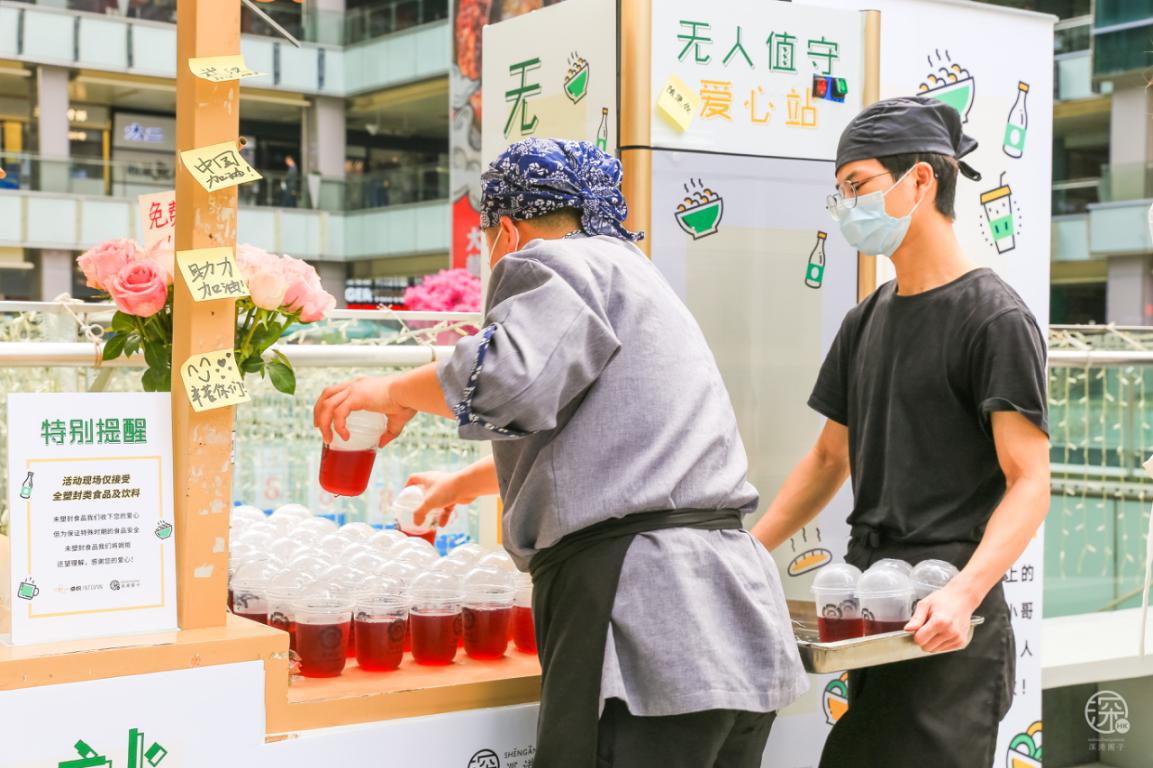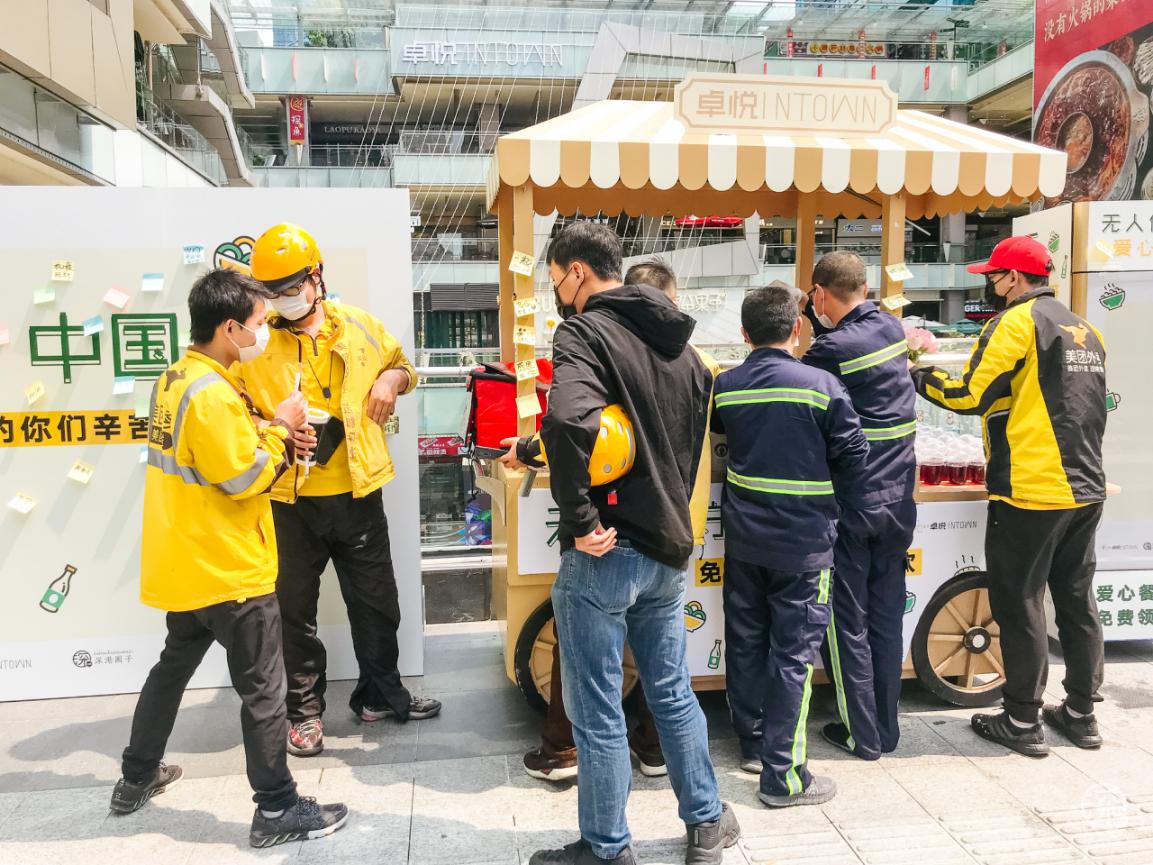 3月3日至3月8日卓悅INTOWN在街頭專設了一個”無人值守愛心站”,用愛心餐車上放滿了食物冷/熱飲,專門免費贈送給快遞、外賣小哥、環衛工人、警察、城管等一線奔波的人員。