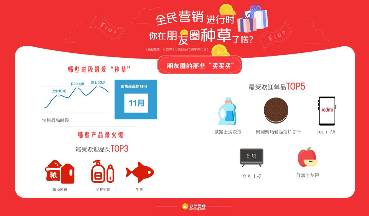 深圳新聞網2020年3月10日訊 線上買菜、線上看病、直播上課、遠程健身……“宅經濟”爆發,使得社群私域流量積累的能量進一步凸顯,全民營銷成為新風口。近日,蘇寧易購發布全民營銷大數據,2020年1月25日至3月5日,蘇寧推客買家數和賣家數分別突破千萬、百萬大關,80后成為朋友圈買、賣“雙主力”,糧油休食、個護家清、生鮮等產品成為最受歡迎的消費品類。