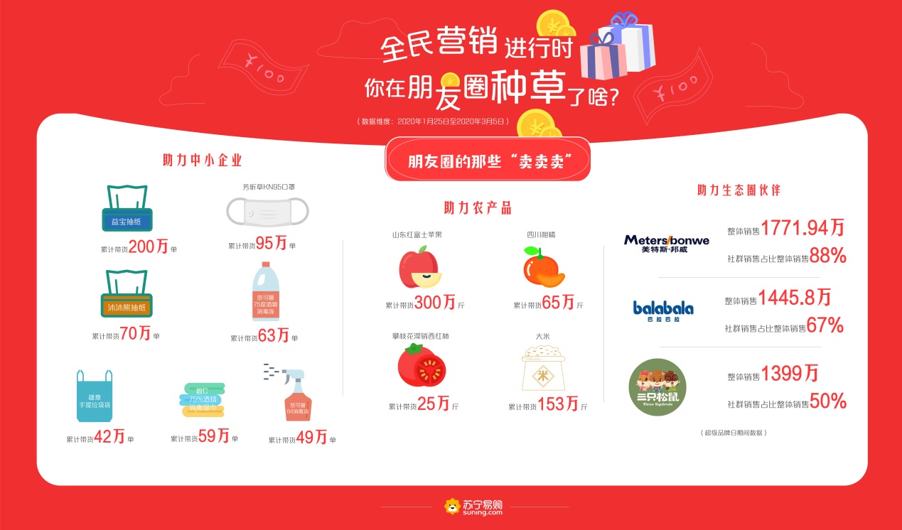 為有效解決農產品銷售問題,也同步解決居民的“菜籃子”“果盤子”“米袋子”,蘇寧利用社群營銷幫助農民賣出超千萬斤農產品。據蘇寧大數據顯示,蘇寧推客累計帶貨山東紅富士蘋果300萬斤、四川柑橘65萬斤、攀枝花滯銷西紅柿25萬斤、大米153萬斤等,成功搭建了農產品流通的橋梁,促進了農產品上行,為戰“疫”勝利奠定了堅實基礎。