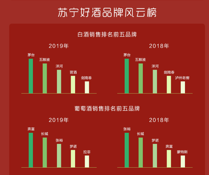 對(duì)比2018年各品牌在蘇寧的銷(xiāo)售表現(xiàn),則是穩(wěn)坐釣魚(yú)臺(tái)的品牌有之,長(zhǎng)江后浪推前浪的品牌有之。具體來(lái)說(shuō),茅臺(tái)、五糧液、洋河一直牢牢占據(jù)白酒品類(lèi)銷(xiāo)售榜前三。在紅酒方面,奔富后來(lái)者居上,從2018年的第四位躍居第一位。啤酒方面,雪花、哈爾濱、青島、百威、福佳的排名無(wú)變動(dòng),而洋酒方面,馬爹利一直穩(wěn)坐第一。古越龍山也一直是黃酒品牌銷(xiāo)售top1。