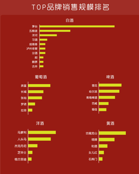 具體來(lái)說(shuō),從蘇寧超市公布的品牌銷(xiāo)售規(guī)模排行榜來(lái)看,茅臺(tái)、五糧液、洋河、習(xí)酒、劍南春、瀘州老窖、汾酒、郎酒、賴(lài)茅、古井成為當(dāng)之無(wú)愧的白酒品類(lèi)銷(xiāo)售top10品牌。奔富、長(zhǎng)城、張?jiān)!?mèng)諾、拉菲則成功問(wèn)鼎葡萄酒銷(xiāo)售top5,雪花、哈爾濱、青島、百威、福佳在啤酒品類(lèi)中銷(xiāo)售表現(xiàn)最好。馬爹利、古越龍山則分別成為洋酒、黃酒品類(lèi)銷(xiāo)售冠軍。