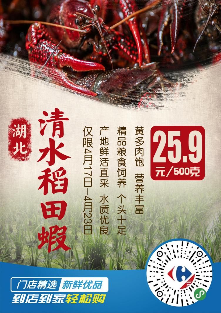 15號開始捕撈的這批湖北“清水稻田蝦”將于16號完成分揀裝車,發往家樂福全國各地大倉,17號,家樂福位于北京,上海、哈爾濱,長沙,成都,昆明,廣州,深圳等地的155家門店鮮活開售,恰逢家樂福418購物節,嘗鮮價低到25.9元/500克(僅限4月17日至23日)。同時,顧客還可以通過家樂福小程序、蘇寧易購app、蘇寧小店App、及美團、餓了么下單,享受1小時送到家的極致“鮮“體驗。