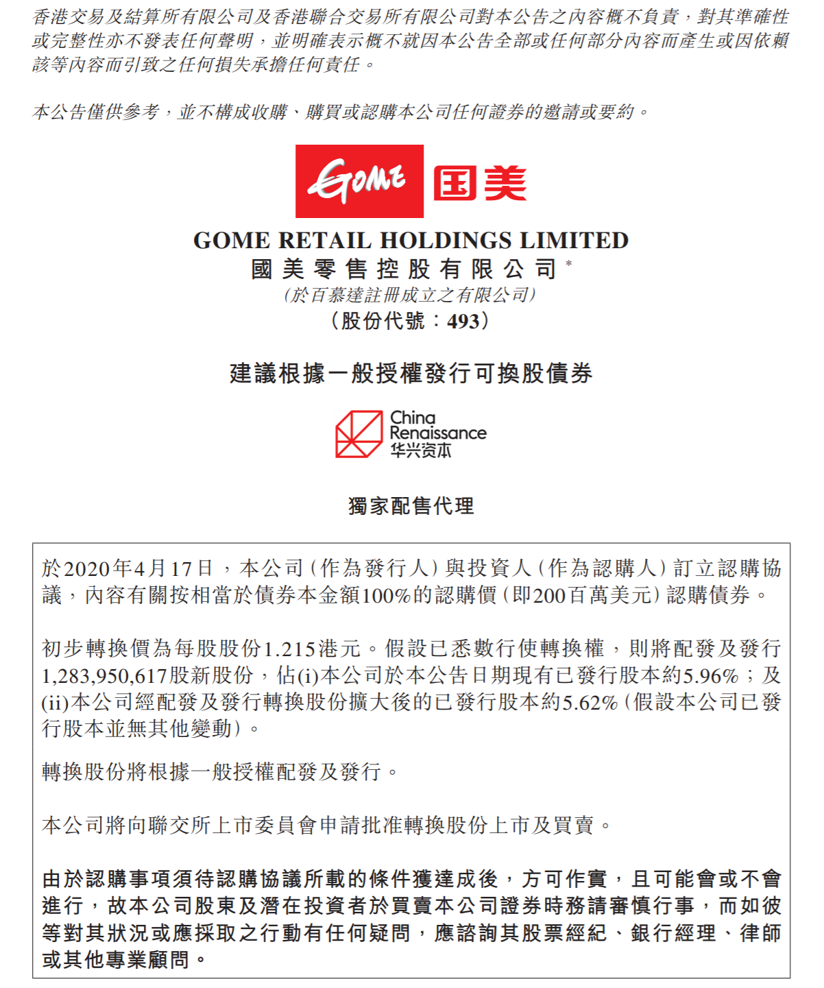 公告稱(chēng),拼多多以總計(jì)2億美金的可轉(zhuǎn)換債券方式對(duì)國(guó)美進(jìn)行戰(zhàn)略投資。根據(jù)協(xié)議,初步股份轉(zhuǎn)換價(jià)為每股1.215港元,分別較國(guó)美零售2020年4月17日收盤(pán)價(jià)及截至2020年4月16日前五個(gè)連續(xù)交易日之平均收盤(pán)價(jià)溢價(jià)66.44%及68.75%。