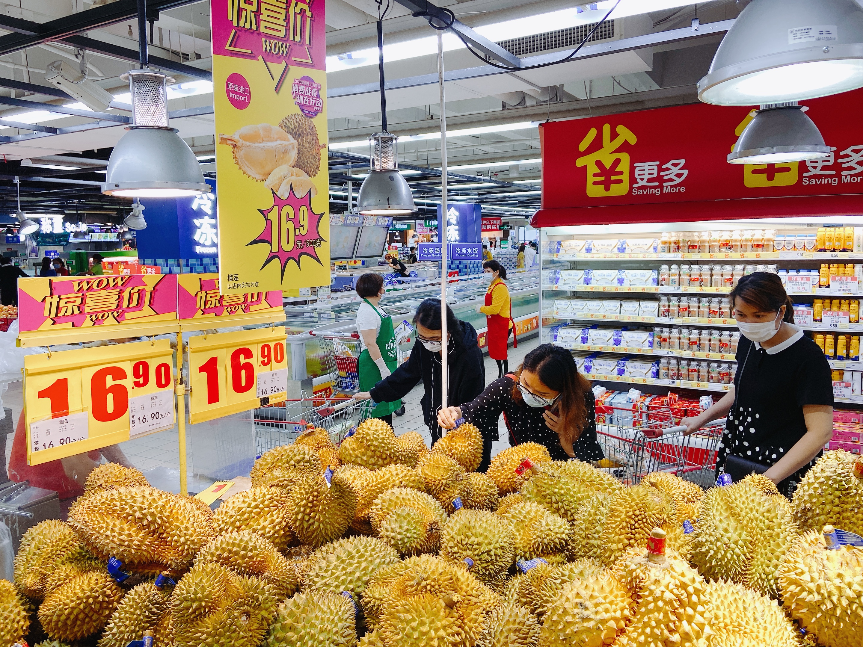 4月19日,記者來到家樂福一門店實地探訪。剛一步入生鮮區域,便被“泰國進口榴蓮,白菜價16.9一斤”的促銷口號所吸引。整個生鮮區不乏各色接地氣的促銷口號,吆喝聲此起彼伏,吸引不少消費者駐足選購?!皠偵鲜械奶﹪鹫眍^,你看這個個頭、還有這個味道你聞聞,(每斤)只要16.9,比我們小區附近的生鮮超市還便宜”,一位受訪者對高性價比的泰國榴蓮贊不絕口。此次探店,記者聽到消費者最多的反饋是“品質更好了,品種更多了”。家樂福深諳消費者的需求,想要促進消費,首先要給消費者提供更多更好的選擇?!拔覀冞@次推出的’四月品鮮季’活動,有來自泰國、菲律賓等東南亞國家的反季水果,也有來自巴西、湖北的水產肉類。16.9元一斤的泰國金枕榴蓮、4.9元一斤的菲律賓切割蕉、25.9元一斤的湖北清水稻田蝦這幾天一直占據暢銷榜前三的位置”,該店負責人介紹。