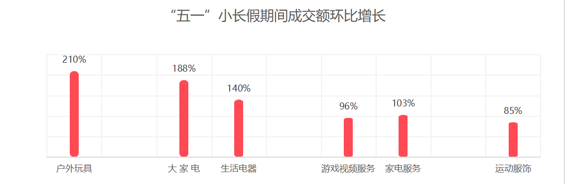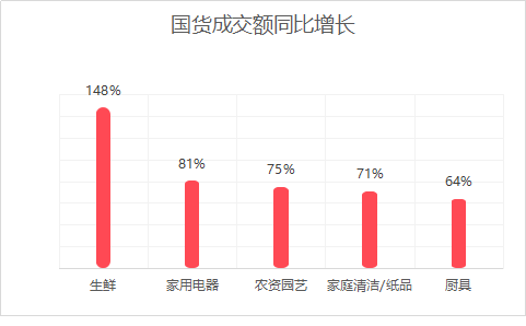 “五一”小長假期間,國產商品的成交額同比增長了52%。國產的生鮮產品十分豐富,農產品觸網利用信息經濟快速的將地方市場轉化為全國市場,成交額同比增長了148%。此外,國產的家電、農資園藝、清潔用品及廚具的成交額同比增長較高。
