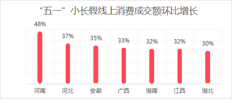 “五一”小長假尤其對河南、河北、安徽等中部省份的線上消費拉動作用更強。由于一線城市的線上消費趨于日常化,人們多外出活動,用親近大自然、戶外活動的方式度過假日。同時,一部分在大城市里工作的人員也在假日返回老家,帶動了中部省份的線上消費。