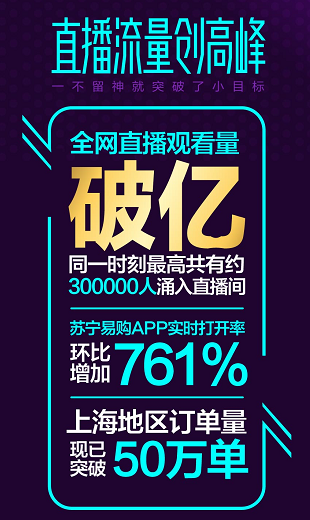 為支持上海五五購物節,蘇寧在20億消費券的基礎上,將為上海消費者推出“超級百億補貼”,還將通過額外發放“爆品專屬補貼”“分期免息補貼”“以舊換新補貼”等讓利補貼,力促上海消費回暖。直播當晚,共計發出5億消費券。