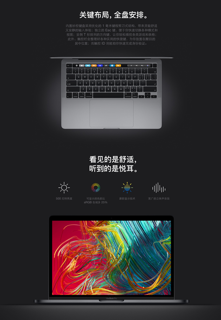 據(jù)了解,MacBook Pro配備第十代4核Intel處理器,Turbo Boost至高可達(dá)3.8GHz。絢麗多彩的視網(wǎng)膜顯示屏具備原彩顯示技術(shù),視覺(jué)體驗(yàn)更真實(shí)自然。還有背光妙控鍵盤(pán)、觸控ID、集成的疾速圖形處理器,以及功能豐富的觸控欄,為你帶來(lái)各種高效工作方式。