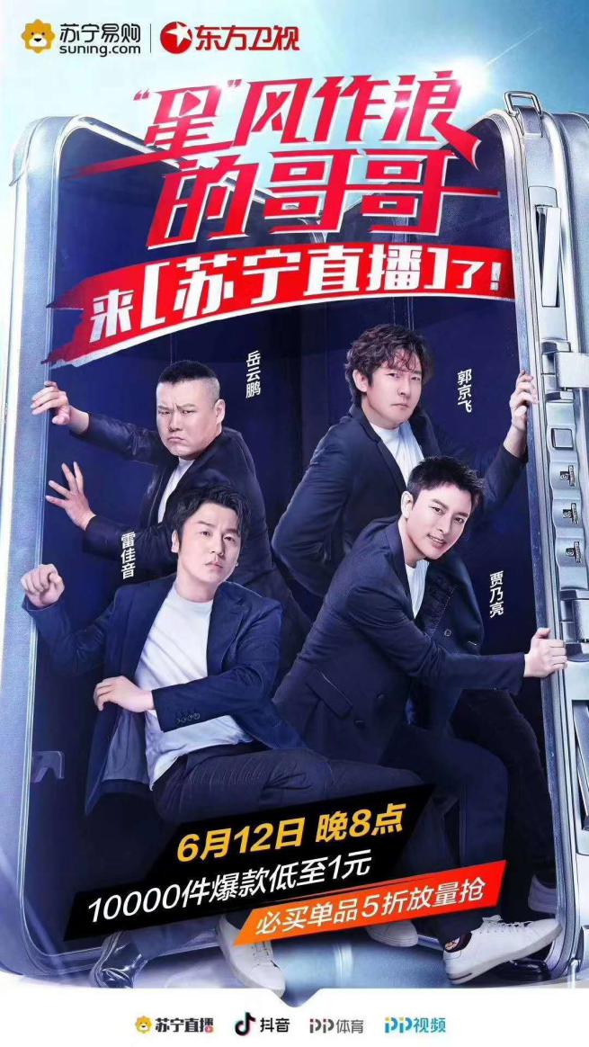 原來,蘇寧將在6月12日晚8點開啟以“星”風作浪的哥哥為主題的直播活動,共計3個小時。正所謂娛樂購物兩不誤,極限挑戰將陣容搬到了直播間,4位明星搭檔主持,帶領用戶感受全方位的品質化購物,煥新精彩生活。