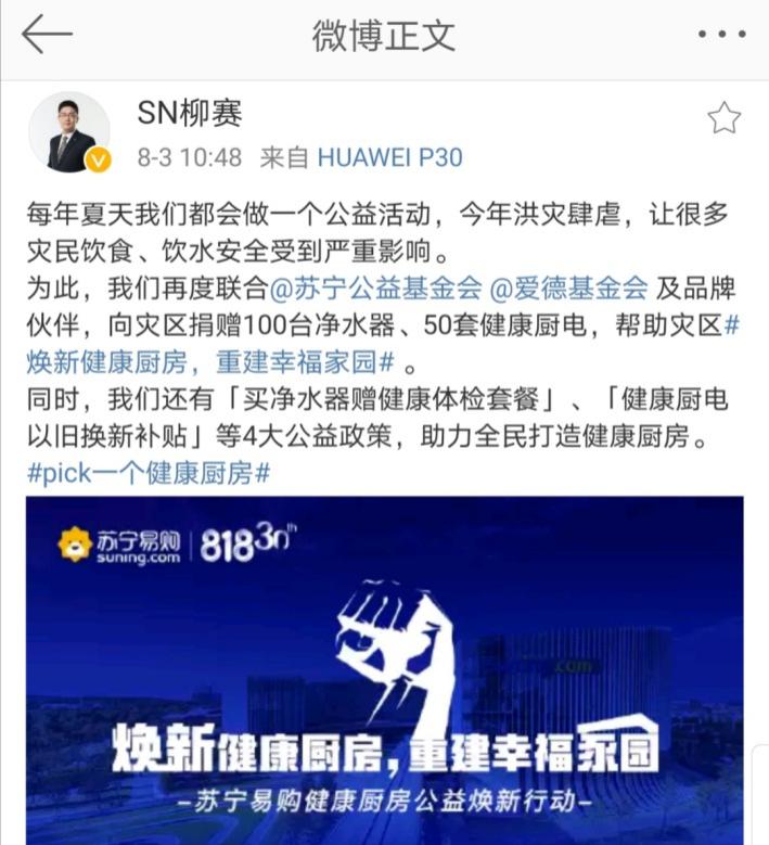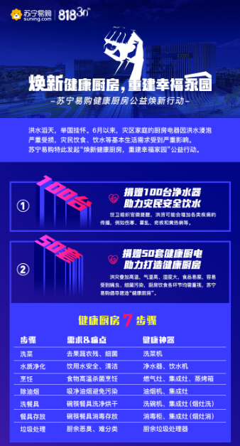 昨日,蘇寧繼發布“戰汛六條”后,又聯合蘇寧公益、愛德基金會及老板電器、美的、A.O.史密斯、安吉爾、法迪歐、惠而浦等各大品牌,發起“煥新健康廚房,重建幸福家園”公益活動,面向災區送出100臺凈水器、50套健康廚電,并向全民推出四大公益福利政策。