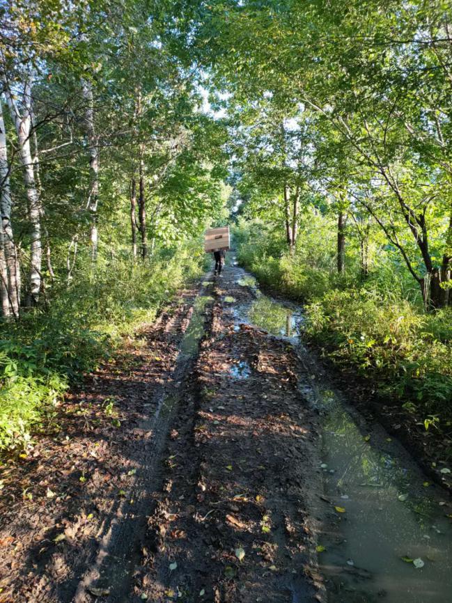 一路開下來,車身濺起不少泥垢。快到目的地時,一段泥濘的林間小路攔住了王能的去路。原來,道路積水過多,泥土過軟,車輛不能前行。王能隨即將車停靠在路邊,直接卷上褲腿,扛起電視前行。兩公里的林間路,本就不輕松,扛著電視更是“難上加難”。