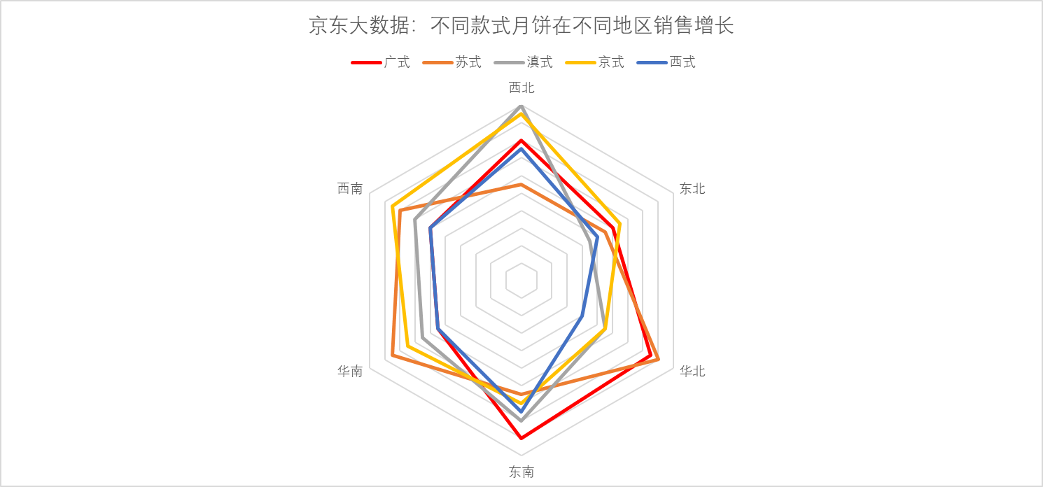 此前有報告顯示,消費者購買月餅渠道更多樣化,已然形成線上為主、線下為輔的趨勢。而隨著京東渠道的滲透、物流的下沉,很多偏遠地區(qū)的線上消費比例也越來越大,比如西北地區(qū)消費者購買廣式和京式月餅的同比增長分別達160%和190%,線上銷售的方式打破了區(qū)域間的地理限制,跨區(qū)域嘗鮮成為潮流,而且促進了全國各地節(jié)( chi)日( huo)的交流。