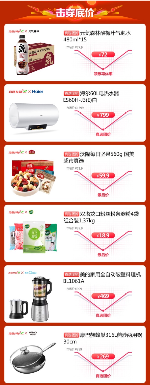 參與真選萬人團的產品,大家電如海爾電熱水器,市場價1599元,真選團購價低至799元;美的滾筒洗衣機,市場價3599元,真選團購價2499元……優惠力度非常之大,部分產品優惠可超千元。
