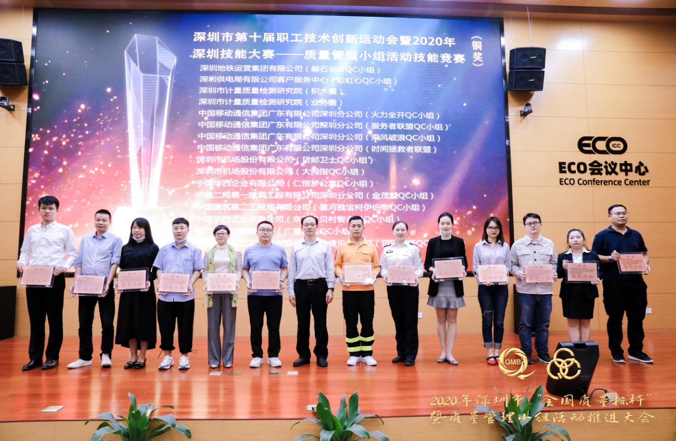 現場,獲得深圳市第十屆職工技術創新運動會暨2020年深圳技能大賽——質量管理小組活動技能競賽金獎的小組深圳市中興通訊股份有限公司低空飛行QC小組、中國華西企業有限公司冠澤金融中心QC小組為大家作了精彩發表展示。由市總工會基層組織建設和經濟工作部二級調研員張麗英宣讀“深圳市第十屆職工技術創新運動會暨2020年深圳技能大賽——質量管理小組活動技能競賽”結果的通報,并為16個金獎小組進行授牌,市政協常委、市質量協會執行會長李榕,市科協機關黨委副書記、紀委書記劉衛東,市婦聯組聯發展部二級調研員嚴俊勇,工商聯會員部部長劉傳分別為32個銀獎和32個銅獎小組進行授牌。