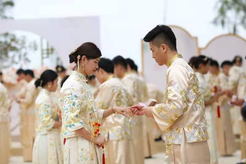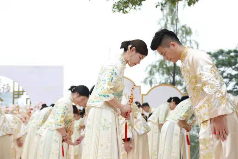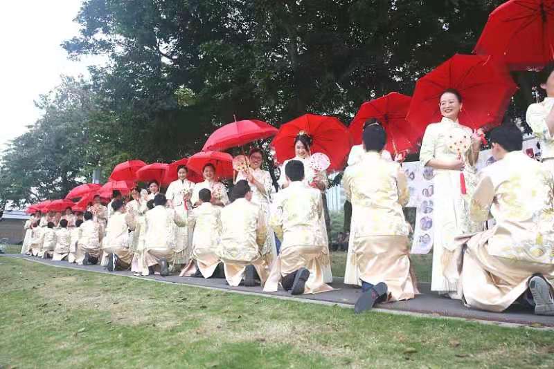 活動伊始,新人手舉紅傘穿過連理橋,在玫瑰園情話闖關(guān),在中西禮堂進(jìn)行找新娘等默契互動,在自然展覽廳俯瞰香蜜公園全貌,與林立高樓與大片叢林相映成景的最美天際線合影,最后在氤氳浪漫的花香湖和花蜜湖畔,在親友與來賓的祝福下,40對新人身穿中式禮服,誦讀莊嚴(yán)的誓詞,許下今生不變的承諾。