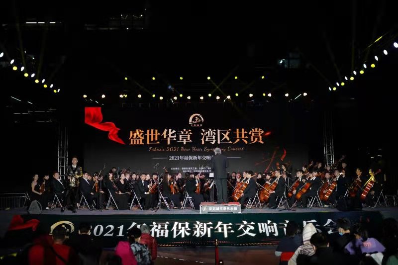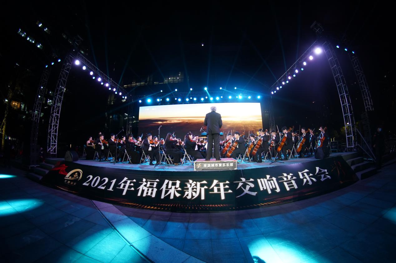見圳客戶端·深圳新聞網2020年12月29日訊 昨晚,“盛世華章,灣區共賞”——福保新年交響音樂會在長富金茂大廈東廣場激情奏響。本次音樂會由福田區福保街道黨工委、辦事處,福保街道總工會主辦,旨在通過東西合璧的音樂盛宴,向中外人才展示福保開放、包容的國際化街區形象,豐富轄區居民的精神文化生活,提升職工幸福感、獲得感。本場音樂會由深圳城市愛樂樂團音樂總監兼首席指揮雷雩執棒,深圳城市愛樂樂團的藝術家們傾情演出,福保轄區企業員工、港籍青年和外國友人共400多位觀眾參與。