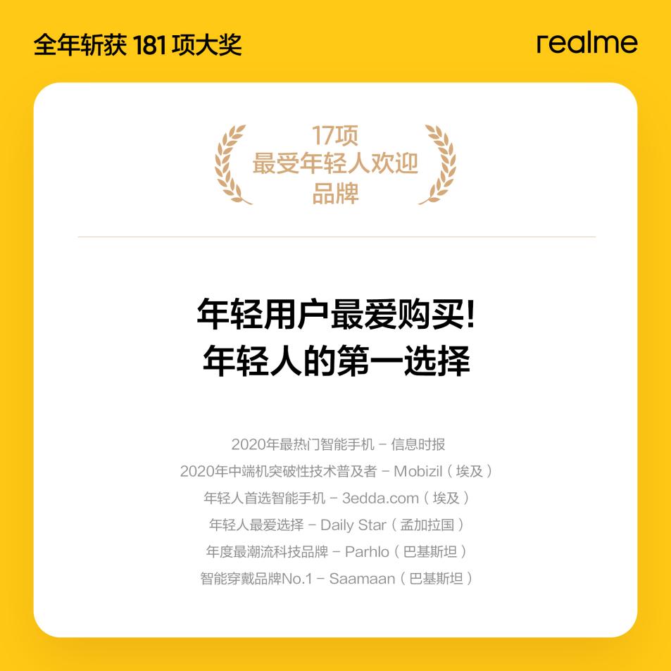 自創立以來,realme一直面向年輕用戶群體,基于對年輕人審美與偏好的精準洞察與理解,不斷滿足和超越年輕科技愛好者的需求,這一策略在東南亞、南亞、歐洲、非洲等市場獲得極大認可。2020年,全球給予realme“年輕人最喜愛品牌”等相關獎項達17項,用實力證明realme是“年輕人第一選擇”。同時,realme一舉網羅全球各大產品獎項,充分證實了“好產品會說話,產品才是硬實力”這句被商界奉為圭臬的卓見。