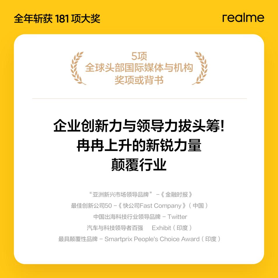2020年,realme在全球斬獲了17個企業和品牌維度的獎項,企業創新力與領導力獲得業界認可。國際權威媒體《金融時報》肯定了realme在亞太地區的領先地位。Financial Times、快公司、Twitter、Exhibi等媒體與機構授予realme“亞洲新興市場領導品牌”、“最佳創新公司50”、“中國出海科技行業領導品牌”、“汽車與科技領導者百強”以及“最具顛覆性品牌”五項大獎。realme品牌潛力不斷釋放,業界普遍認為,在過去的一年里,realme品牌的增勢強勁,全球品牌價值在不斷躍升。