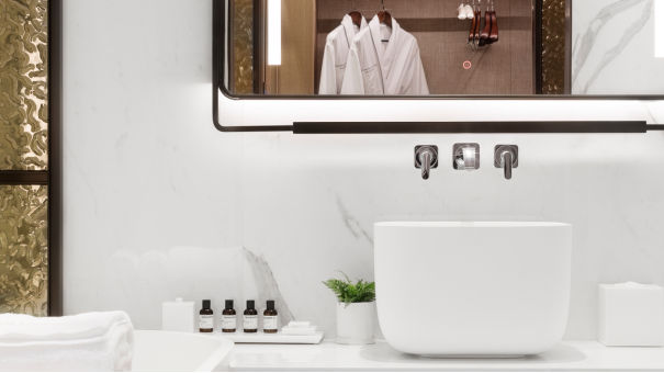 夜幕降臨,賓客可慵懶地置身浴缸之中,閉目享受由B&O音響帶來的音樂廳般沉浸式體驗?;驈娘h臺取過剛剛煮好的香茗,讓茶香雅韻充盈唇齒。酒店備好的浴品套裝,將讓賓客從發絲到肌膚,皆浸潤于LE LABO的香氛宇宙,奢寵體驗無與倫比。