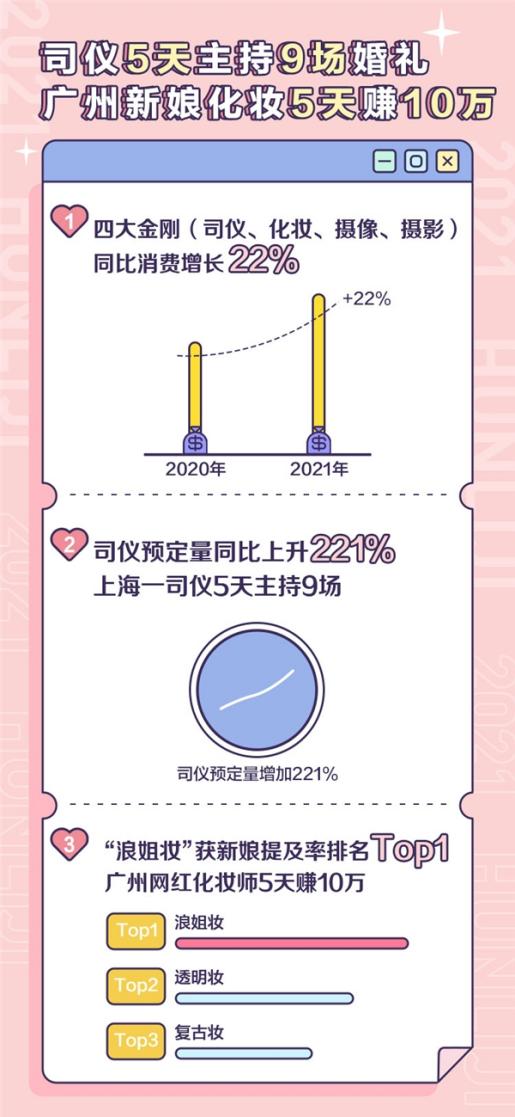 “快要忙瘋了,五一5天辦了150多場婚禮,第一天就有60場,去年這時候婚禮只有個位數,今年我們員工都加班加點連夜趕工搭建場地。”婚禮紀商家Sunny喜鋪婚禮副總趙佳佳在接受采訪的時候表示,不僅商家忙,新人也非常忙,Z世代的新人都習慣于通過線上咨詢、直播下單等互聯網形式進行婚禮消費,省去了線下奔波的時間。