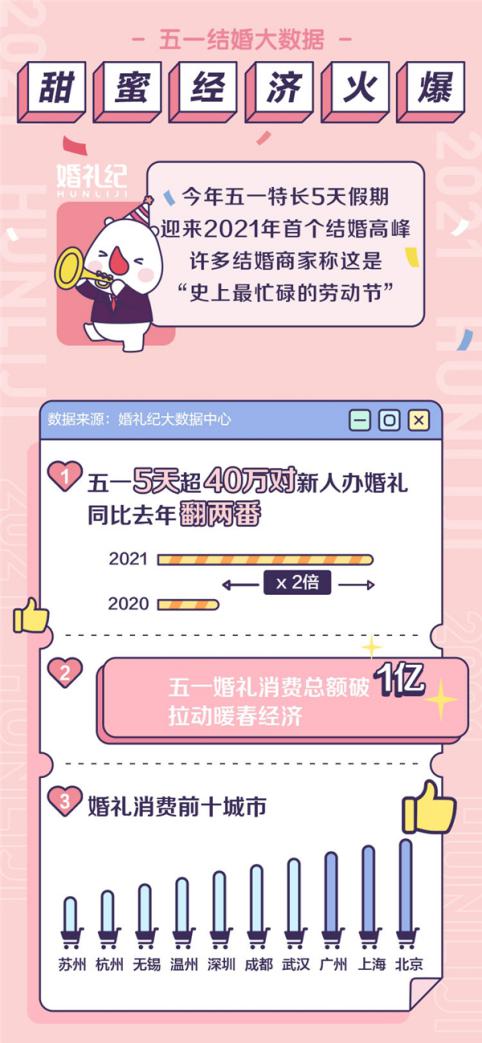 數據顯示,五一迎來2021年首個結婚高峰,5天內超40萬對新人舉辦婚禮,同比去年翻兩番。五一婚禮消費總額破1億,在一定程度上拉動暖春經濟。婚禮消費前十城市分別是北京、上海、廣州、武漢、成都、深圳、溫州、無錫、杭州、蘇州。