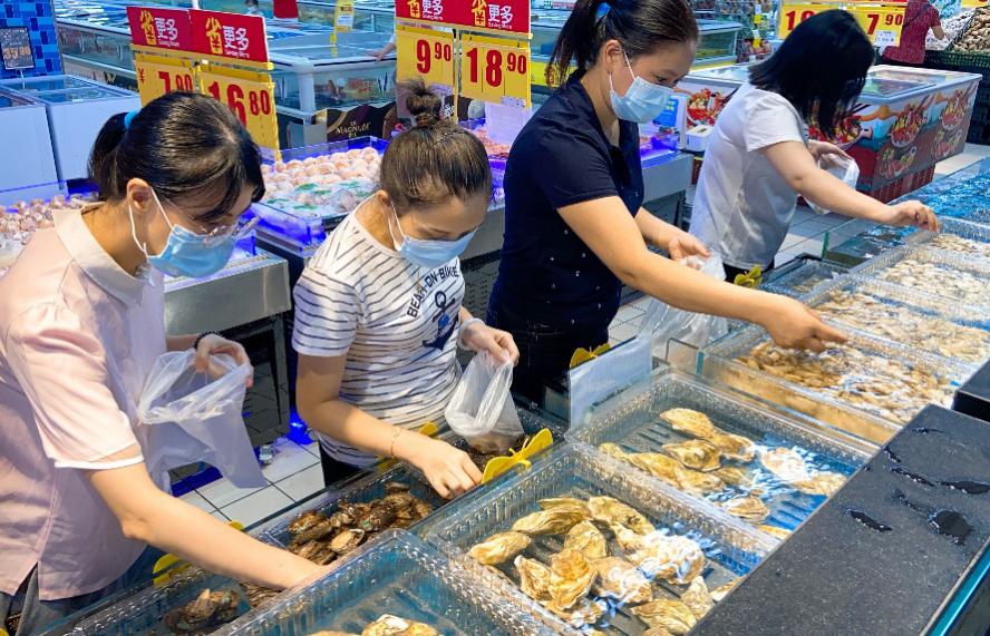今日早晨,在家樂福深圳紅寶店,來自福建寧德、山東青島、浙江舟山、廣西北海、廣東珠海等地的鮮活生蠔、大閘蟹、基圍蝦、珍寶蟹、皮皮蝦、多寶魚等各類國產鮮活水產和來自俄羅斯的帝王蟹,英國的面包蟹,美國的珍寶蟹等各類進口鮮活海鮮呈現在消費者面前,讓早市搶購的顧客躍躍欲試。