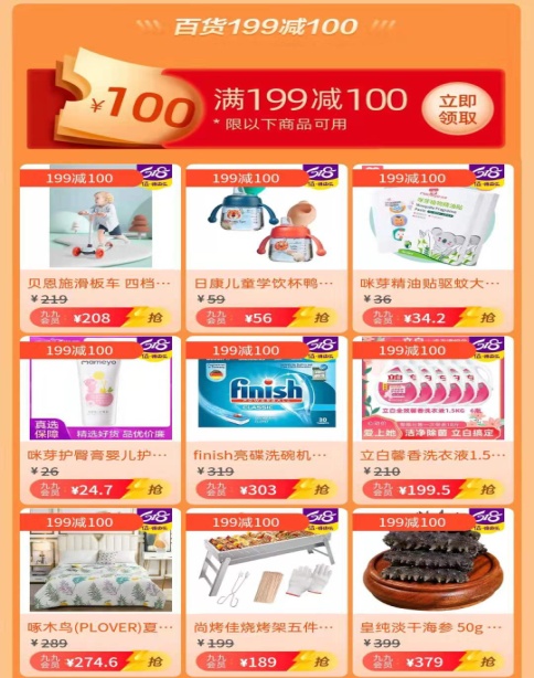 進入“真快樂”APP自營百貨618大促“滿199減100”專區,食品酒水、家居日用、美妝個護、母嬰玩具四大品類多款商品超級劃算,多維度滿足大家的需求。