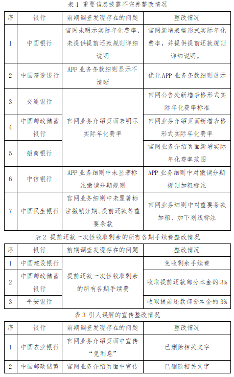中國銀行、交通銀行、中國郵政儲蓄銀行、招商銀行等銀行完善了官網信用卡分期業務實際年化費率的披露; 中國銀行、中國建設銀行、中信銀行、中國民生銀行等銀行完善了撤銷分期、提前還款規則等重要信息的披露;中國建設銀行、中國郵政儲蓄銀行、平安銀行針對消費者提前還款,由原先一次性須收取剩余所有各期手續費,修改為免收剩余手續費或僅收取一定比例違約金;中國農業銀行、中國郵政儲蓄銀行、中國民生銀行刪除了“免利息”“手續費比例不隨分期期數的增長而提高”等容易引起消費者誤解的宣傳語。各銀行存在問題及整改情況如下: