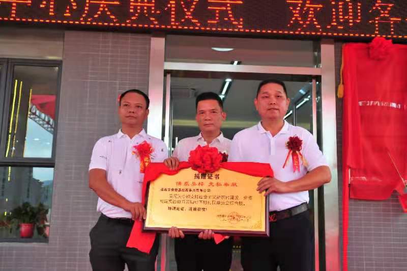 在落成典禮中,深圳安宏基控股集團有限公司彭康輝董事將大樓辦公鑰匙移交給硁下村黨支部書記彭志康。村支書彭志康、五云鎮慈善會會長彭志響一起贈牌匾給深圳安宏基控股集團有限公司彭康輝董事。