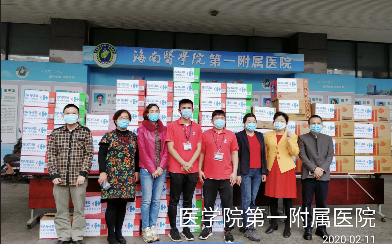 海口蘇寧家樂福于2月11日上午,向海南醫學院第一附屬醫院捐贈了一批生活方便食品,涵蓋速食面、牛奶、八寶粥、功能飲料等。