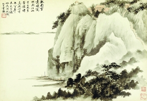 吳湖帆在所藏米芾《多景樓詩帖》冊首補繪的《北固山江山圖》(局部)