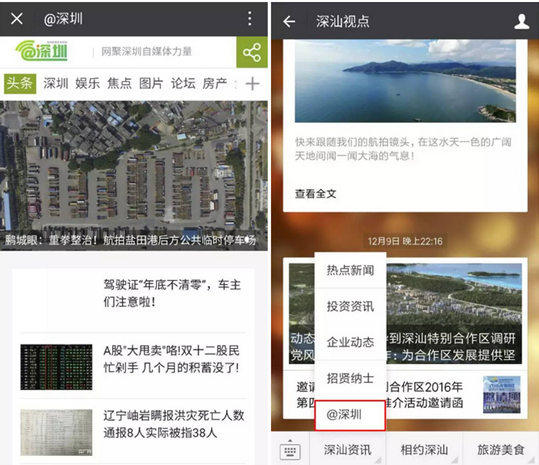 @深圳本質是手機網站,可嵌入在微信公眾號底部菜單欄中(也可嵌入APP客戶端中),且其采用了最新H5編碼技術,可左劃右劃更換頻道,也可上劃下劃翻看內容,