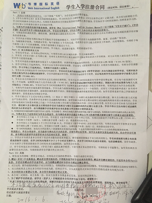 本人與韋博英語深圳寶安中心(位于海雅繽紛城)在2016年3月6日,簽訂《學生入學注冊合同》,總計學費34800元,我已經超過1年時間,但只上了六節課。詢問退款之事,回復只可轉讓,再找人,就拖延時間。