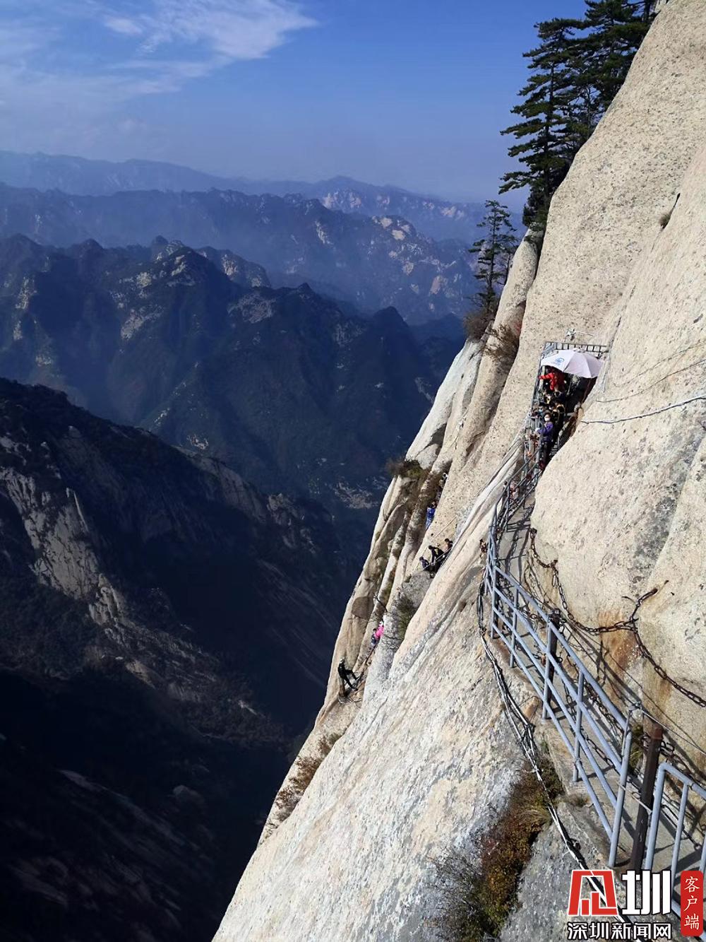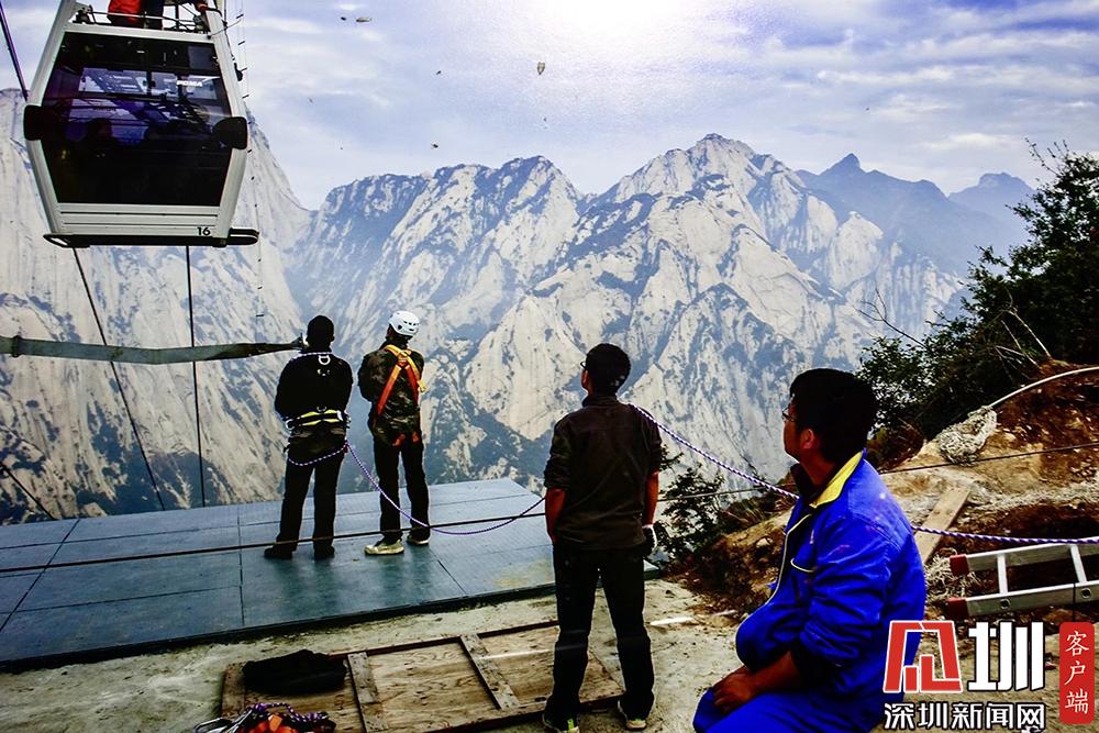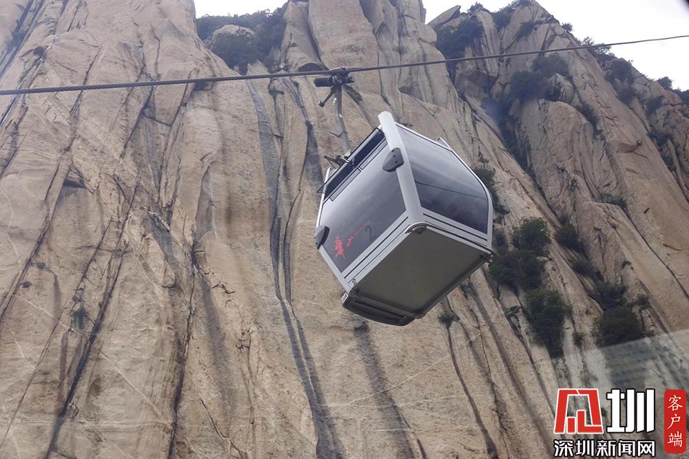 華山西峰的太華索道是迄今為止世界上第一條采取崖壁開鑿硐室站房、兩上兩下的起伏式走向、設中間站的單線循環脫掛式索道,總計投資5億余元建設。李酮攝。