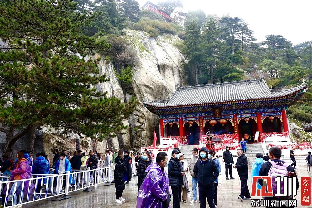共有72個半懸空洞,道觀20余座,其中玉泉院、都龍廟、東道院、鎮岳宮被列為全國重點道教宮觀,有陳摶、郝大通、賀元希等著名的道教高人。排隊等待參觀的游客。李仁奇攝。