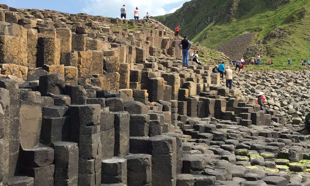約五千萬(wàn)年前,在今天蘇格蘭西部?jī)?nèi)赫布里底群島一線至北愛爾蘭東部火山非常活躍,一股股玄武巖巖熔流從裂隙的地殼中涌出,隨著灼熱的熔巖冷卻收縮,結(jié)晶的時(shí)候,開始爆裂呈規(guī)則的六邊形形態(tài)。李仁奇 攝