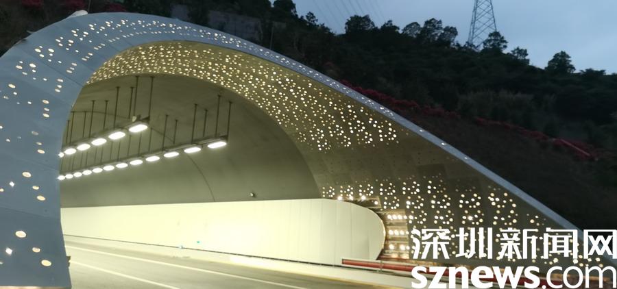 到達隧道的中段部分,映入記者眼簾的是一道道彩色的燈帶,這些燈帶可以根據環境光變換成七種不同的顏色,可謂科技感十足。在即將駛出隧道口200米處,我們能看采用彩色絲印搪瓷鋼板呈現的坪山地貌風光、鹽田山海風光,這意味著,我們穿過了馬巒山的山體,一下子從坪山來到了鹽田區范圍內的惠深沿海高速,這趟坪山到鹽田的隧道之旅僅僅不到10分鐘就要結束了。