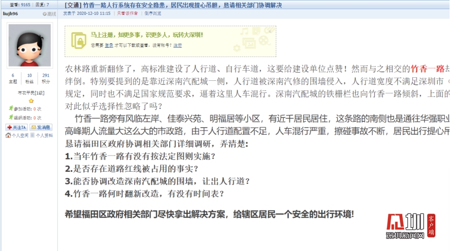 記者了解到,竹香一路附近有多個住宅小區,近千名居民,同時附近有多所學校,該路段也是附近居民學生的必經之路。2020年12月10日,網友“liujh96”發帖報料后,2020年12月22日,福田區香蜜湖街道辦事處在論壇做了回應。該回復稱正積極協調查,尋找當年竹香一路代建單位,督促其移交道路至交通局,由于該路段尚未移交交通局管養,暫無法重新規劃整改道路。