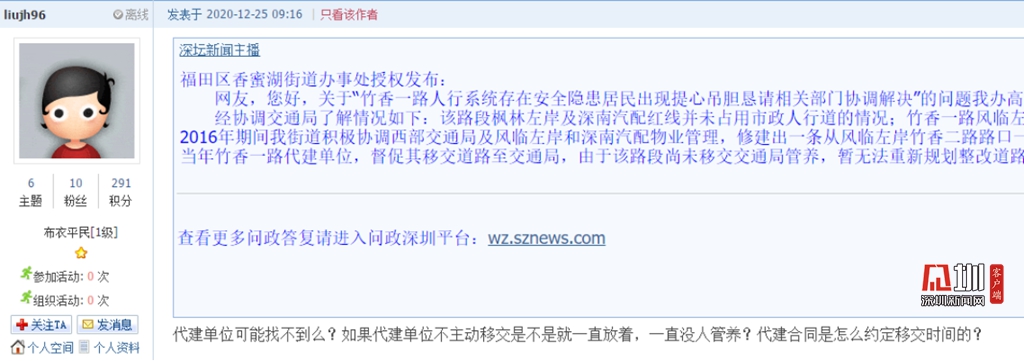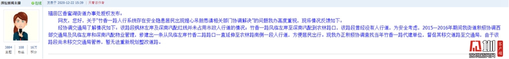 2020年12月22日,福田區香蜜湖街道辦事處在論壇回貼。