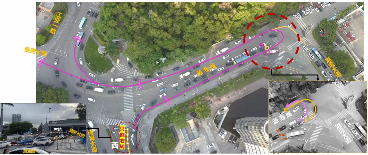 南山區南海大道時間廣場路段是通往蛇口、前海的重要道路,早晚高峰期車流量較大。修地鐵時在南海大道做了“布袋口臨時設施”,南海大道現已經恢復通車,但因臨時設施還未及時拆掉,路口紅綠燈沒有啟用。加之車道收窄,原本可以快速左轉北行的車流被擠成一條右轉車道,再擠到老碼頭掉頭,四車道變一車道,導致高峰期多數車輛爭搶道,既不安全還加劇了擁堵。