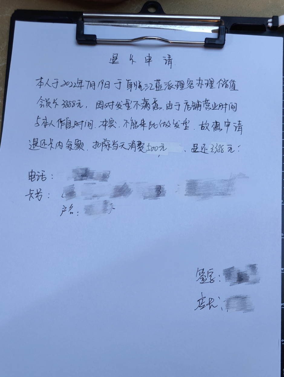 本人于2022年7月19日在該商家處花費3888元充值會員卡,后因對發型不滿意及店鋪營業時間與本人作息時間沖突,故申請退還卡內余額。商家于2023年4月25日同意在5個工作日內退款,但一直拖延,至今仍未退款。