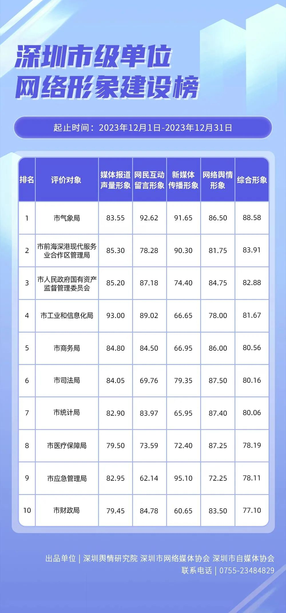 深圳新聞網2月1日訊(記者 陳曉君 實習生 陳佳鈴)2024年1月31日,“深圳各區各單位網絡形象建設榜”(2023年12月期)正式發布,榜單以報道留言聲量、社會生活評價、宣傳策劃質效以及輿情化解能力等為指標,全面考量深圳各區(含大鵬新區、深汕特別合作區)、市級單位(市政府工作部門、市管單位)的網絡形象建設成效,最終形成《深圳各區網絡形象建設榜》和《深圳市級單位網絡形象建設榜》。