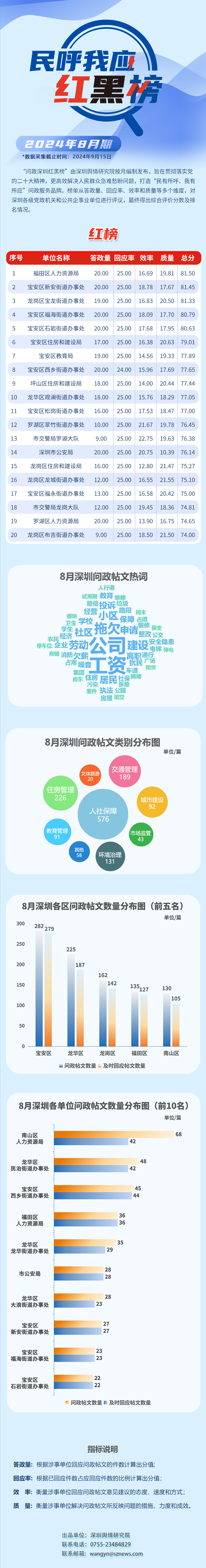 “深圳民呼我應(yīng)紅黑榜”由深圳輿情研究院按月編制發(fā)布,旨在貫徹落實(shí)黨的二十大精神,更高效解決人民群眾急難愁盼問(wèn)題,打造“民有所呼、我有所應(yīng)”問(wèn)政服務(wù)品牌。榜單從答政量、回應(yīng)率、效率和質(zhì)量等多個(gè)維度對(duì)深圳各級(jí)黨政機(jī)關(guān)和公共企事業(yè)單位進(jìn)行評(píng)議,最終得出綜合評(píng)價(jià)分?jǐn)?shù)及排名情況。
