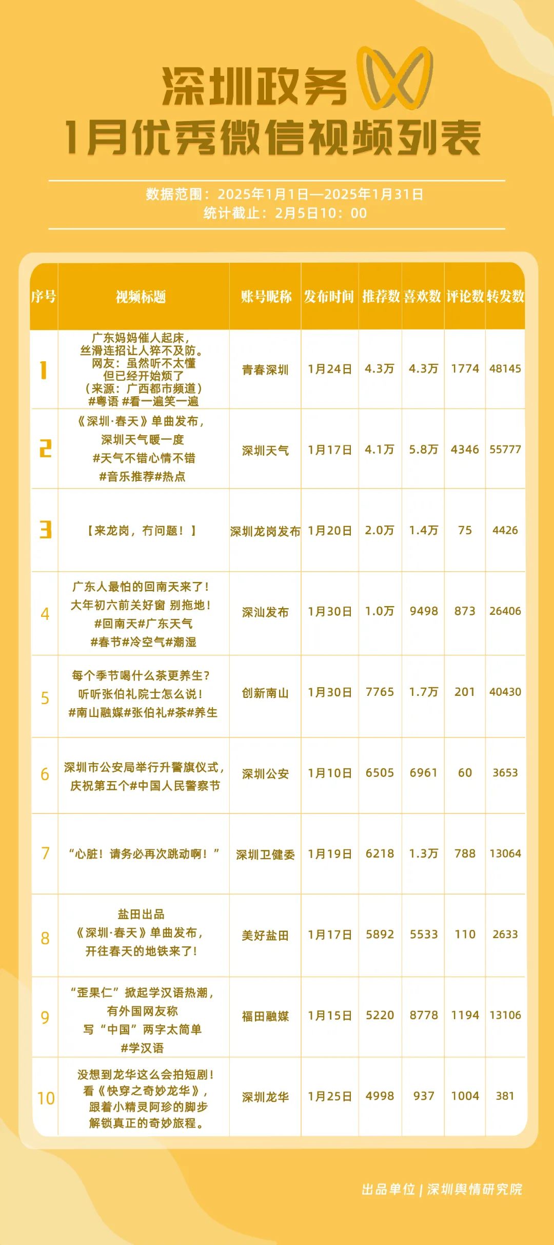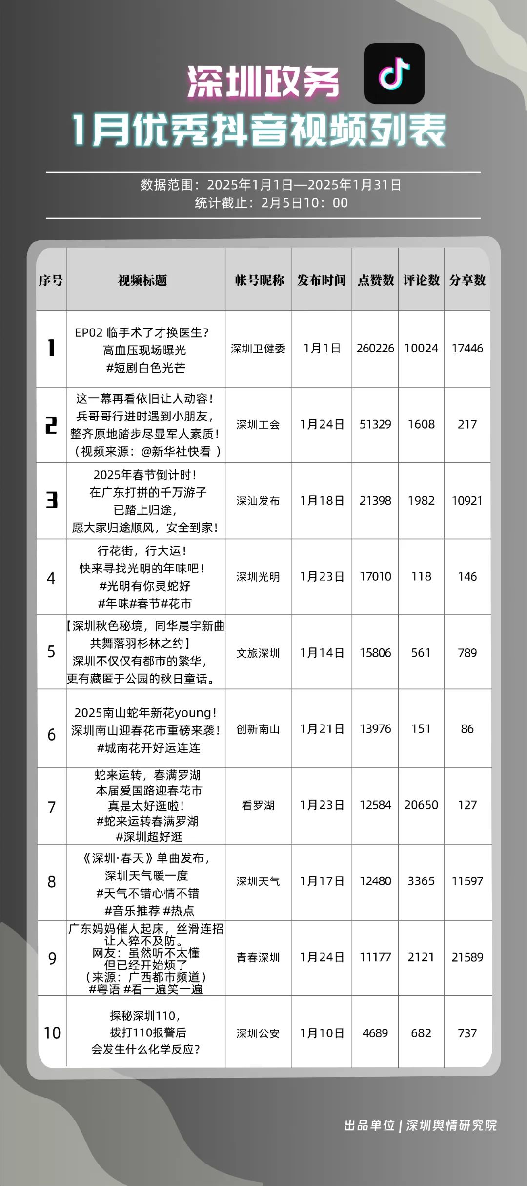 1月,“深圳衛(wèi)健委”“深汕發(fā)布”“深圳天氣”“青春深圳”“看羅湖”“掌上龍崗”“深圳工會(huì)”“創(chuàng)新南山”“文旅深圳”“深圳公安”共10個(gè)政務(wù)抖音號(hào)獲得“深圳優(yōu)秀政務(wù)抖音號(hào)”稱號(hào)。“深圳衛(wèi)健委”“深汕發(fā)布”“深圳天氣”成績(jī)優(yōu)異,綜合實(shí)力較強(qiáng),位于榜單前列。“青春深圳”“看羅湖”等賬號(hào)排名有所提升,彰顯了這些賬號(hào)在拓寬受眾基礎(chǔ)、增強(qiáng)用戶黏性等方面所取得的積極成效。